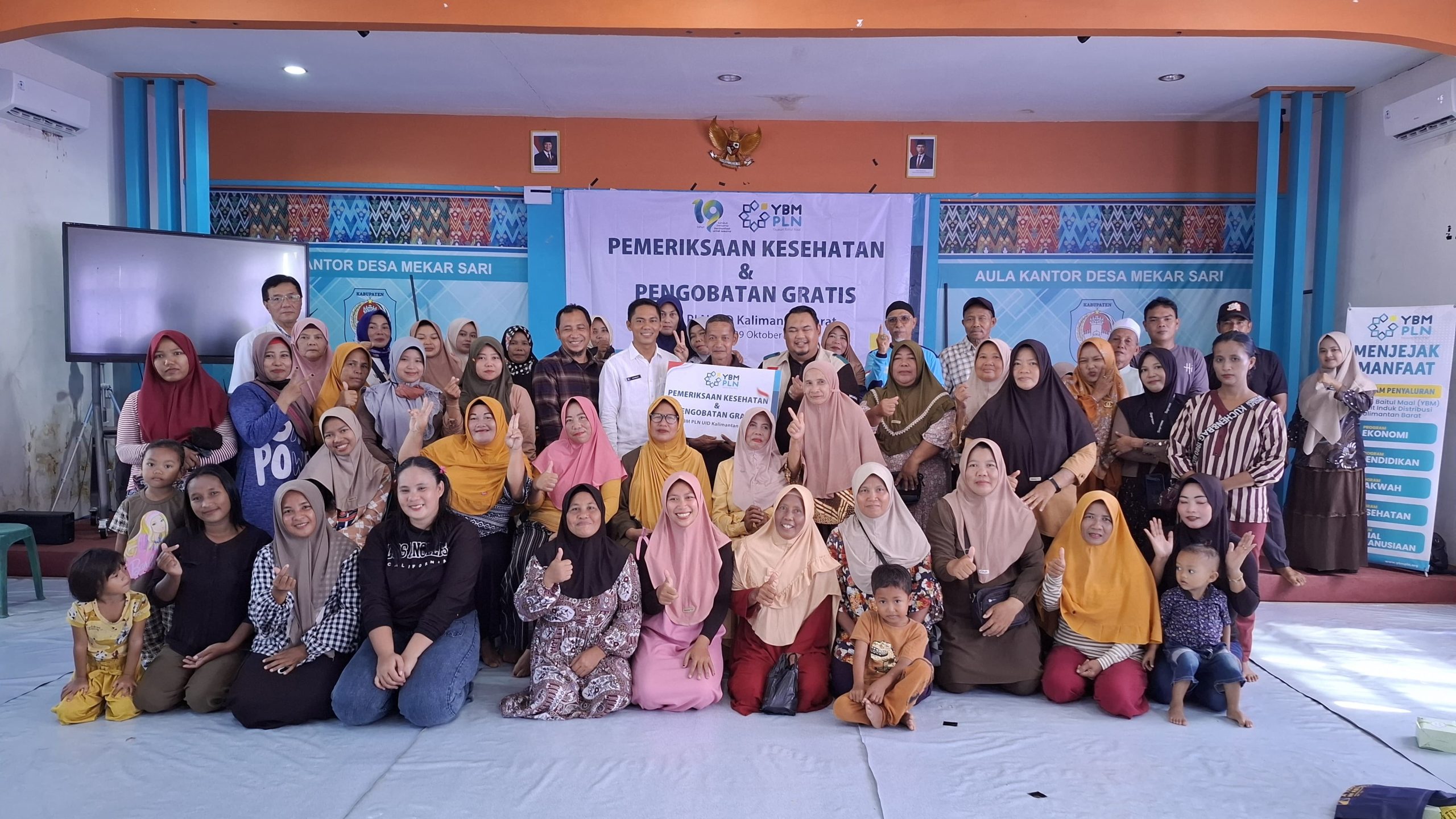 Ketua YBM PLN UID Kalimantan Barat, Mukhlis Zarkasih, dan Kepala Desa Mekar Sari, berfoto bersama Masyarakat Desa Mekar Sari sesaat sebelum kegiatan pemeriksaan dan pengobatan kesehatan gratis dimulai (FOTO/DOK/PLN)